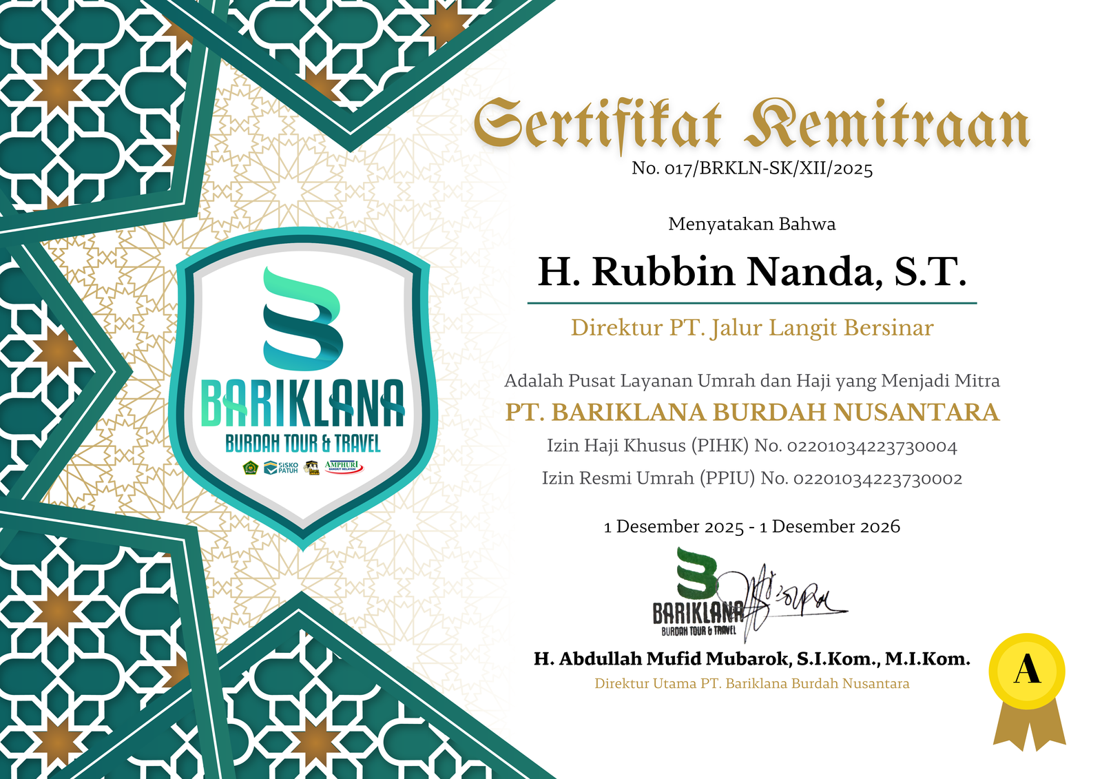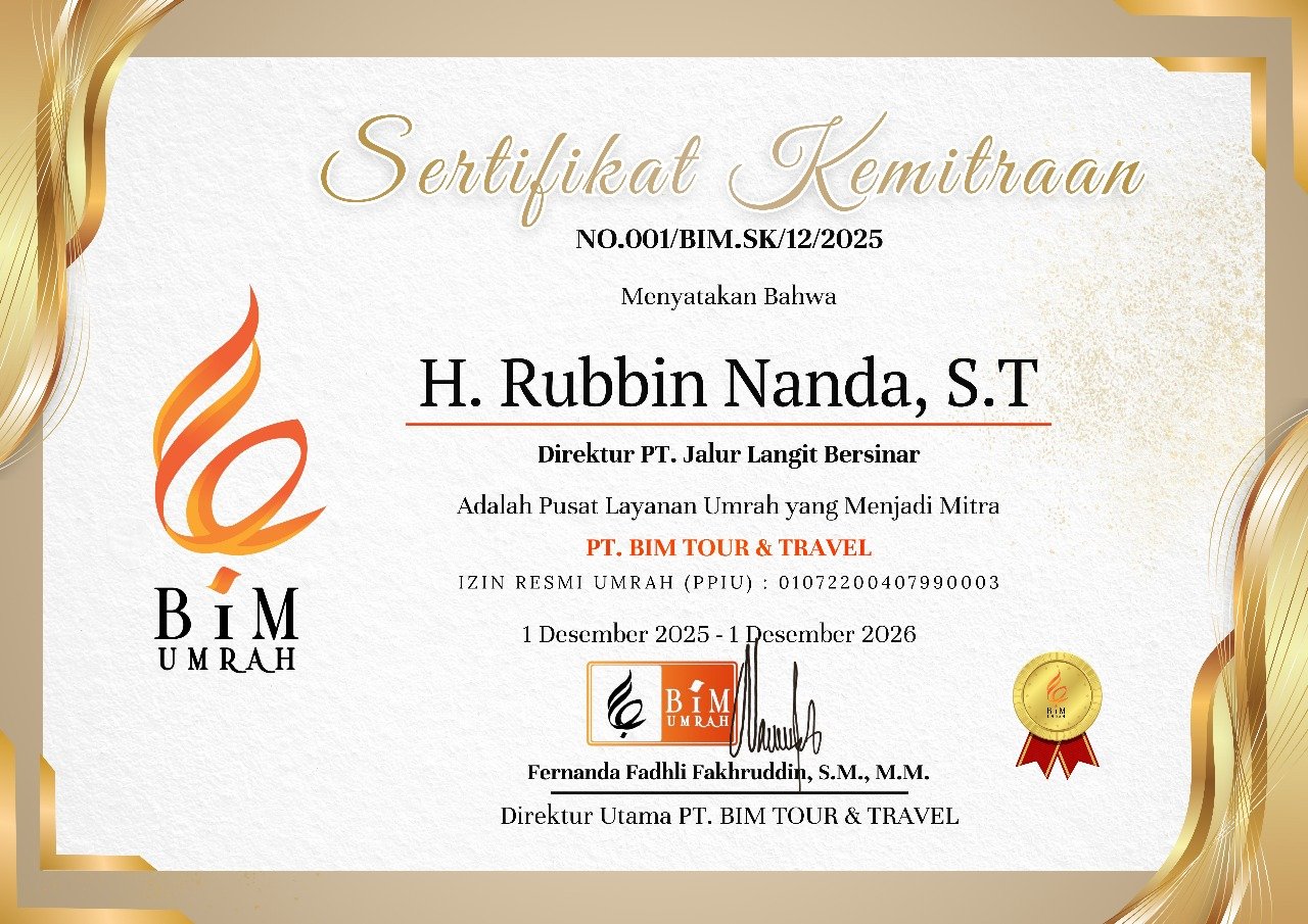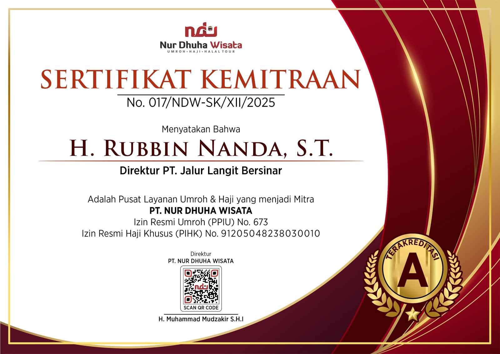 PT Jalur Langit Bersinar dengan bangga memperkenalkan jajaran pimpinan yang berkomitmen membawa Anda ke Tanah Suci dengan layanan terbaik. Dipimpin oleh Bapak H. Rubbin Nanda S.T selaku Direktur Utama, dan didukung penuh oleh Ibu Kristin Andryani sebagai General Manager, kami bertekad memastikan setiap perjalanan Umrah dan Haji Anda berjalan lancar, aman, dan penuh makna spiritual.